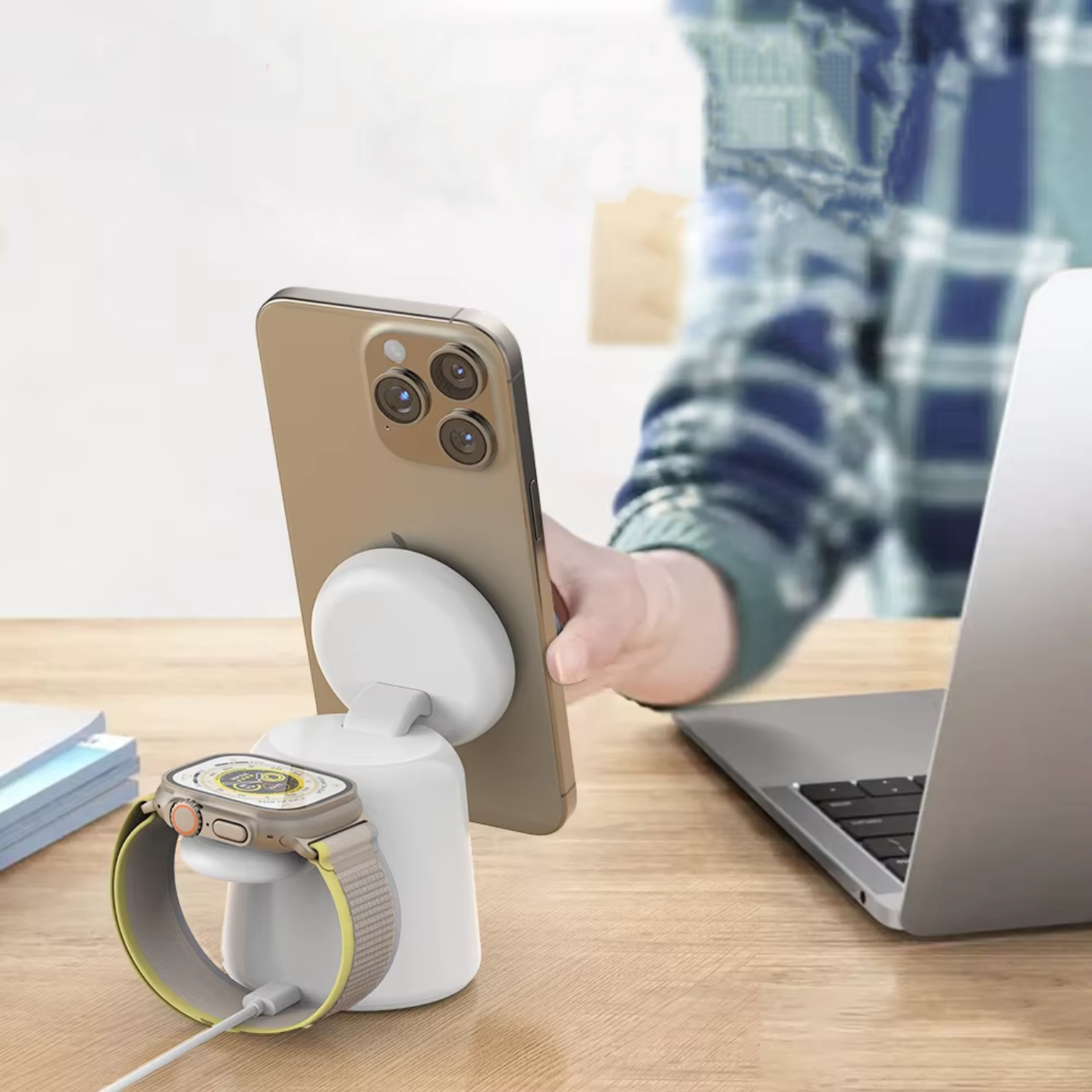 No more juggling multiple cables or struggling with messy desks! The Magnetic 3-in-1 Wireless Charger lets you charge your iPhone, Apple Watch, and AirPods simultaneously with a single sleek station. It’s the easiest way to keep all your devices powered up while maintaining a clutter-free workspace.